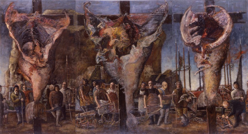 The Box Meeting is a unique work, a landmark painting, which John accomplished while in the force of an intense creative energy that saw him also completing, only a few months previously in 1964, another of his most important and impressive works, the great triptych, ‘Allegory’, involving the arresting composition of three mighty crucified fish which now hangs in the Scottish National Gallery of Modern Art in Edinburgh.
